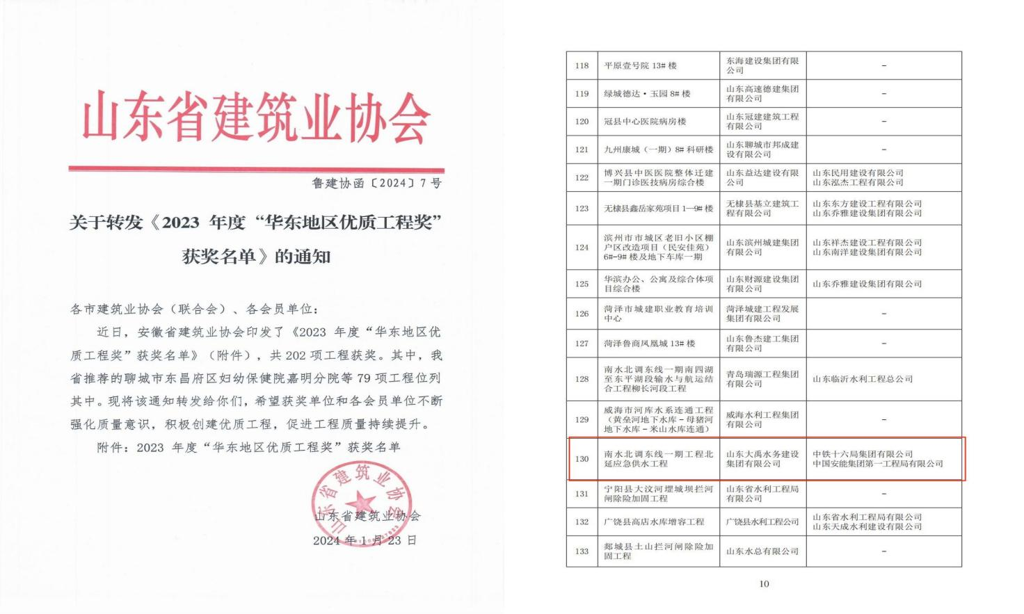 近日,山東省建筑業(yè)協(xié)會發(fā)布2023年度“華東地區(qū)優(yōu)質工程獎”獲獎名單,經(jīng)山東省建筑業(yè)協(xié)會申報、評審委員會推薦、網(wǎng)絡公示及華東地區(qū)建筑(行)業(yè)協(xié)會聯(lián)席會與評審委員會會議審查,集團公司承建的南水北調東線一期工程北延應急供水工程憑借過硬的工程質量在激烈的競爭中脫穎而出,榮獲2023年度“華東地區(qū)優(yōu)質工程獎”。