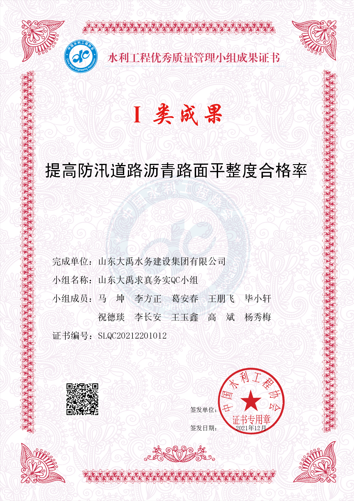 2021年QC小組I類(lèi)成果證書(shū)