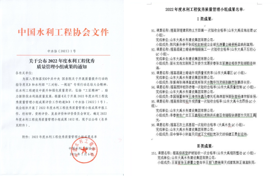 近日,中國水利工程協會公布了“2022年度水利工程優質質量管理小組”成果名單,集團公司申報的7項成果上榜,其中Ⅰ類成果6項、Ⅱ類成果1項。