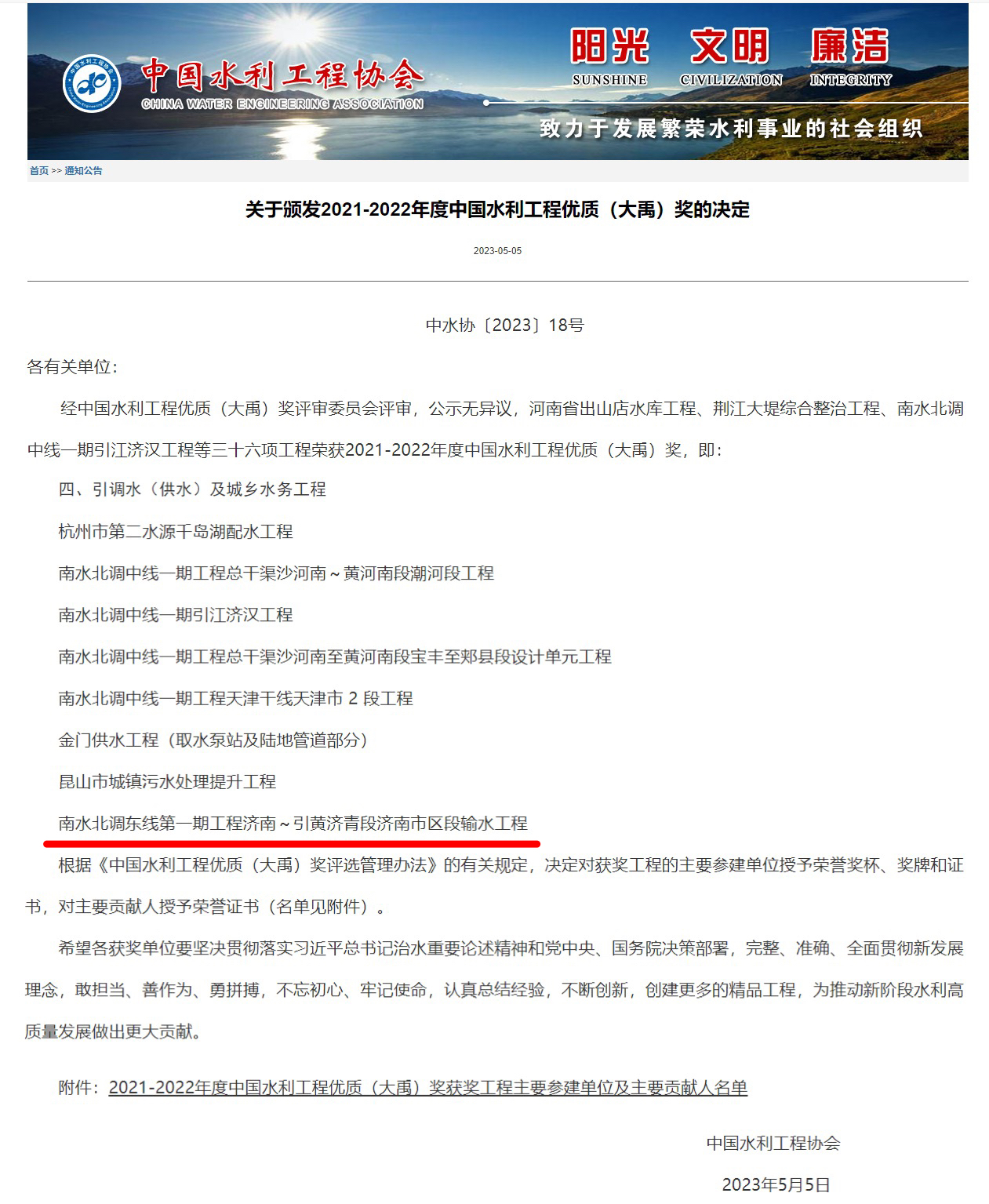 根據(jù)中國水利工程協(xié)會發(fā)布的《關(guān)于頒發(fā)2021-2022年度中國水利工程優(yōu)質(zhì)(大禹)獎的決定》 (中水協(xié)〔2023〕18號) ,由山東大禹水務建設集團有限公司參建的南水北調(diào)東線第一期工程濟南~引黃濟青段濟南市區(qū)段輸水工程項目榮獲中國水利工程優(yōu)質(zhì)(大禹) 獎稱號。