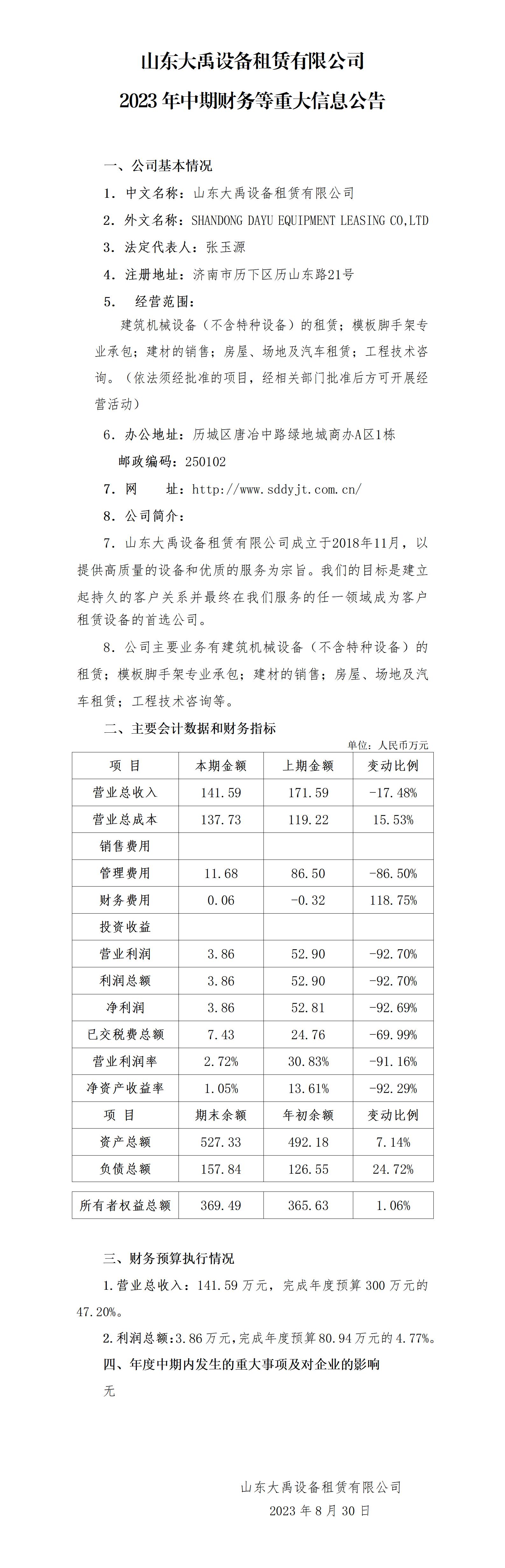 山東大禹設備租賃有限公司2023年中期財務等重大信息公告