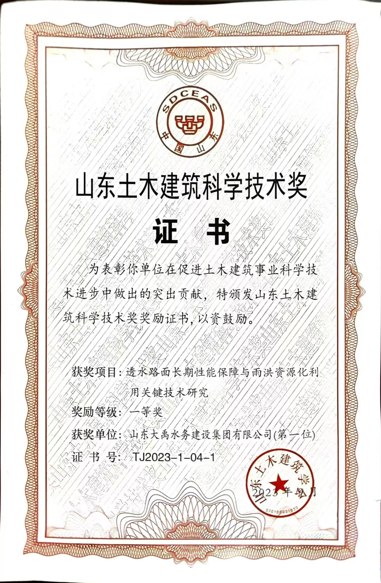 近日,山東土木建筑學會公布了“2023年度山東土木建筑科學技術獎(科技進步獎)獲獎名單”并頒發榮譽證書。由山東大禹水務建設集團有限公司等單位共同申報的“透水路面長期性能保障與雨洪資源化利用關鍵技術研究”項目榮獲“2023年度山東土木建筑科學技術獎”一等獎。