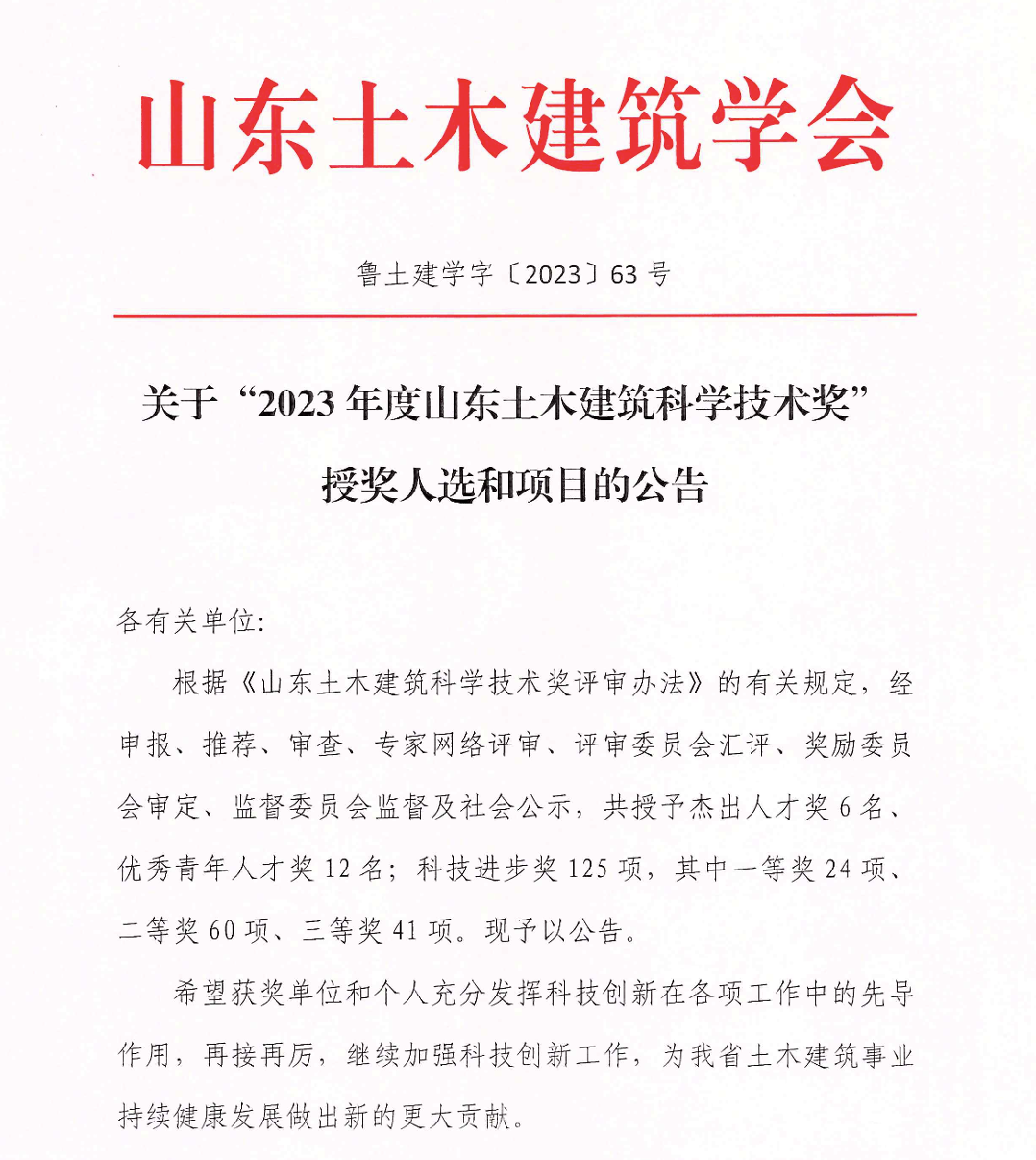 山東土木建筑科學技術獎是山東省住房和城鄉建設廳主管、山東土木建筑學會組織評選的山東省建筑行業科技類最高獎項,此次獲獎是對集團公司綜合實力、科技創新水平的充分肯定。下一步,集團公司將繼續秉持“創新、誠信、務實、高效”的企業精神,踐行國企擔當、履行社會責任,統籌推動工程技術創新創優與重點業務發展的深度融合,以科技創新驅動集團公司高質量發展,為強省會建設貢獻科技力量。