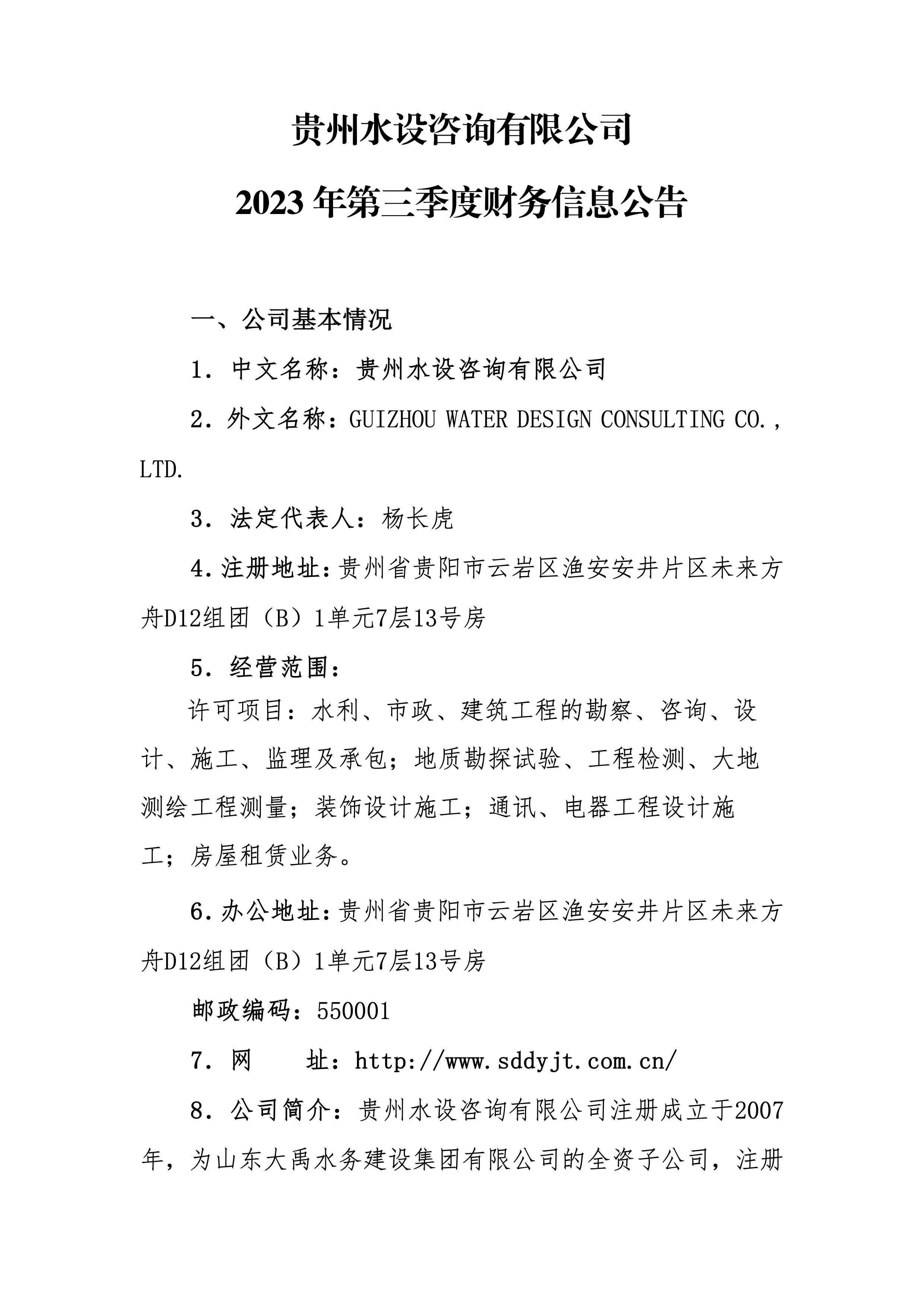 貴州水設咨詢有限公司2023年第三季度財務信息公告