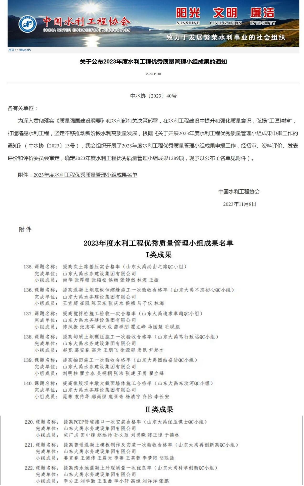 近日,中國水利工程協(xié)會公布了“2023年度水利工程優(yōu)質(zhì)質(zhì)量管理小組”評審結(jié)果,集團公司申報的九項成果經(jīng)過了資料評價、視頻發(fā)布及現(xiàn)場發(fā)布評價、評審委員會審定,最終全部上榜。其中,六項成果榮獲I類成果,三項成果榮獲Ⅱ類成果。