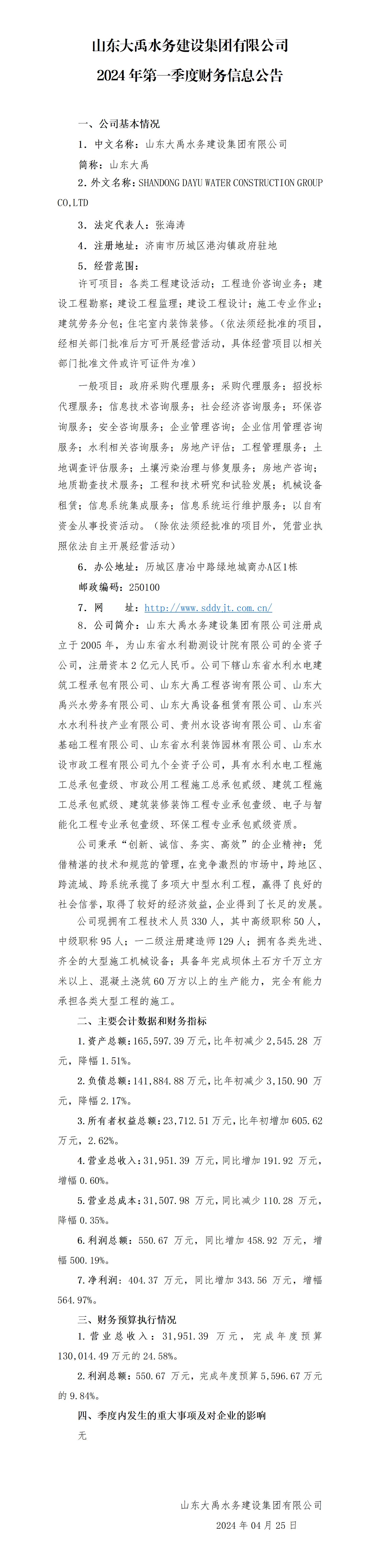 山東大禹水務建設集團有限公司2024年第一季度財務信息公告