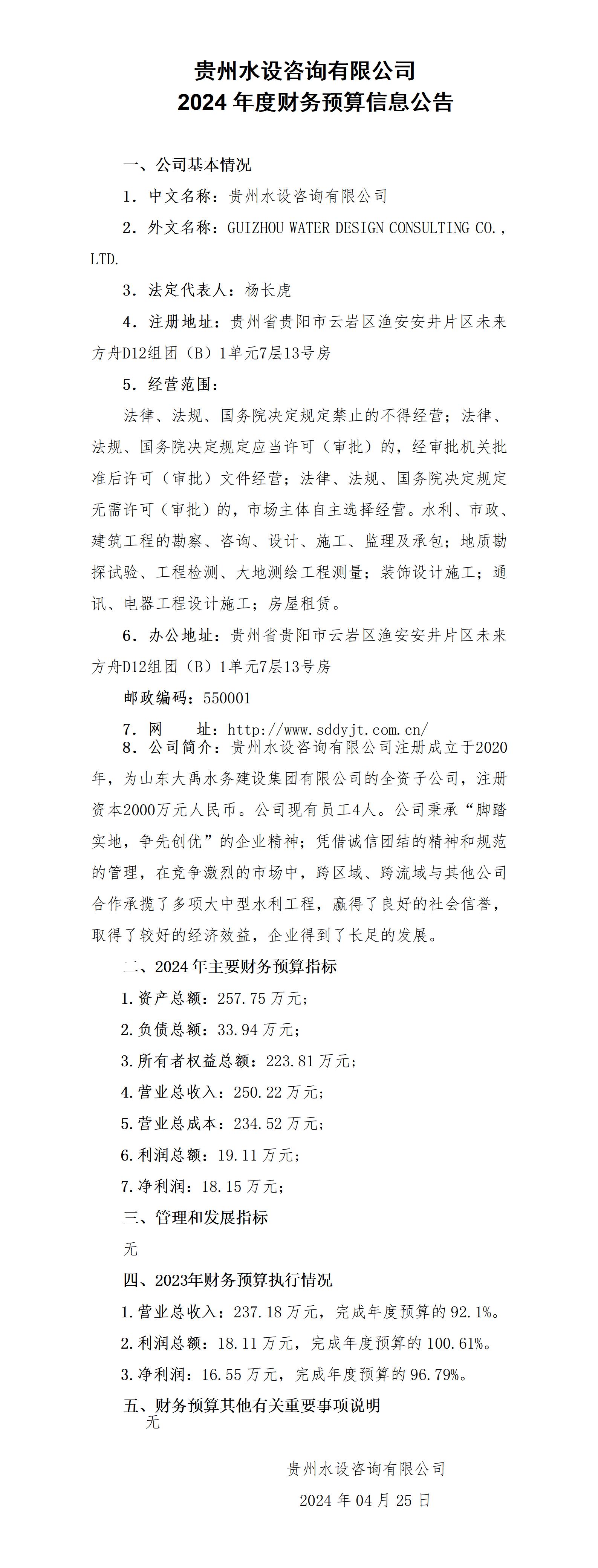貴州水設咨詢有限公司2024年度財務預算信息公告