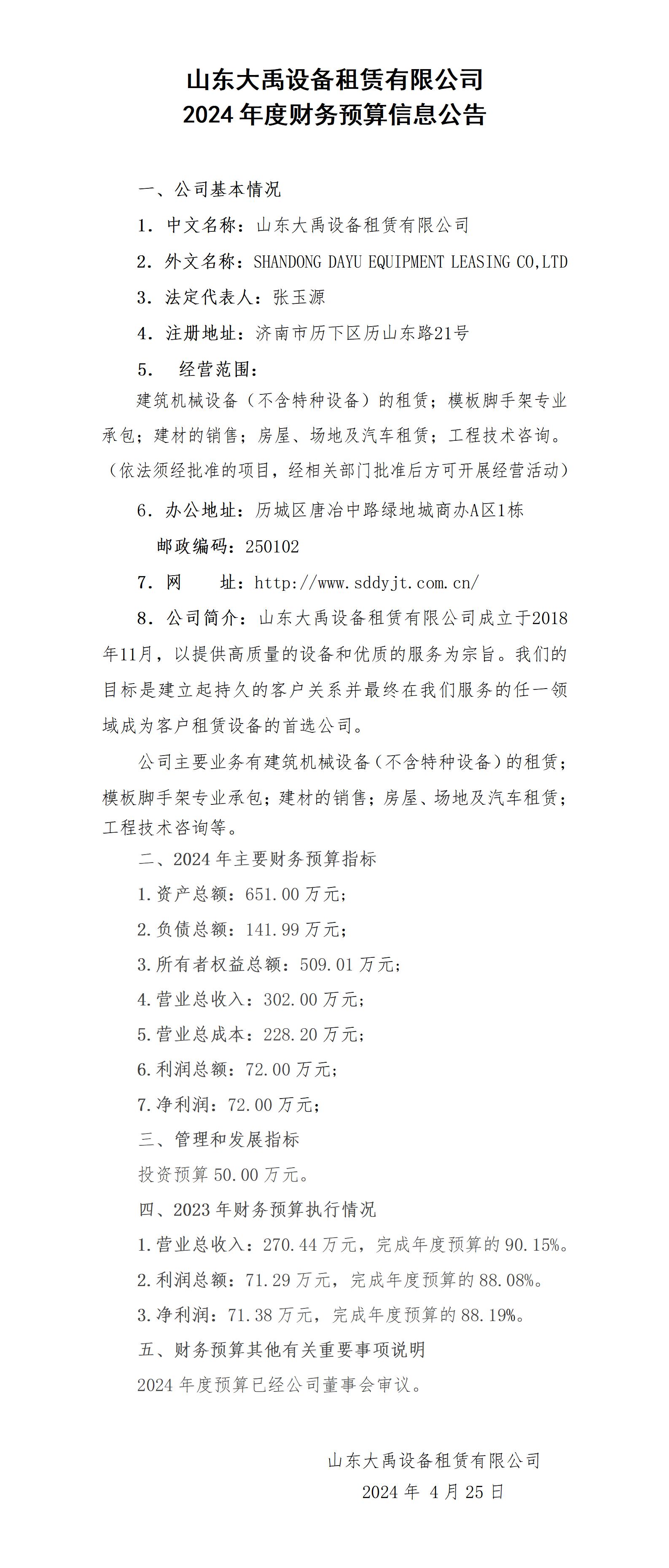 山東大禹設備租賃有限公司2024年度財務預算信息公告