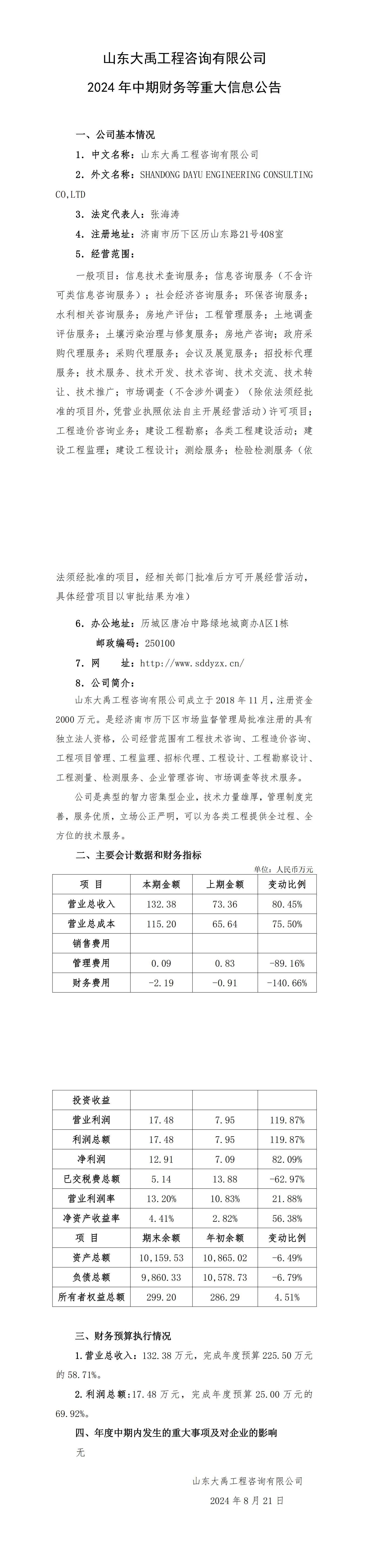 山東大禹工程咨詢有限公司2024年中期財(cái)務(wù)等重大信息公告