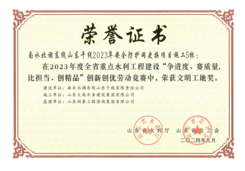 施工5標(biāo)段共更換防護(hù)網(wǎng)54.66km,自開工以來,項目部職工克服施工戰(zhàn)線長、施工作業(yè)面多等管理困難,精心組織施工,合理安排工期,嚴(yán)格質(zhì)量控制,狠抓安全管理,順利完成施工任務(wù),得到建設(shè)、監(jiān)理等單位的高度認(rèn)可,并榮獲山東省水利廳和山東省總工會組織的2023年度全省重點水利工程建設(shè)“爭進(jìn)度、賽質(zhì)量,比擔(dān)當(dāng)、創(chuàng)精品”創(chuàng)新創(chuàng)優(yōu)勞動競賽文明工地獎。