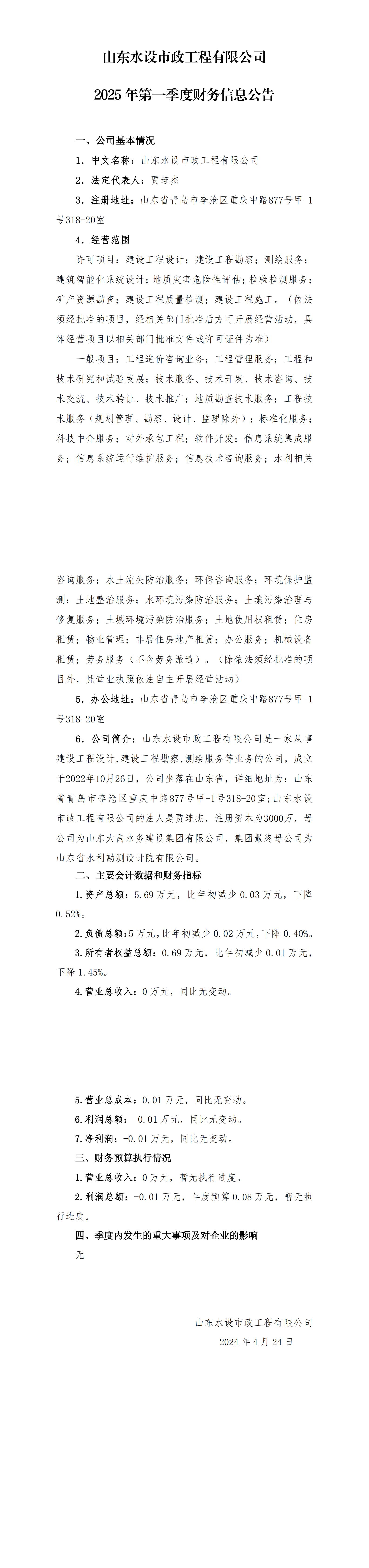 山東水設市政工程有限公司2025年第一季度財務信息公告