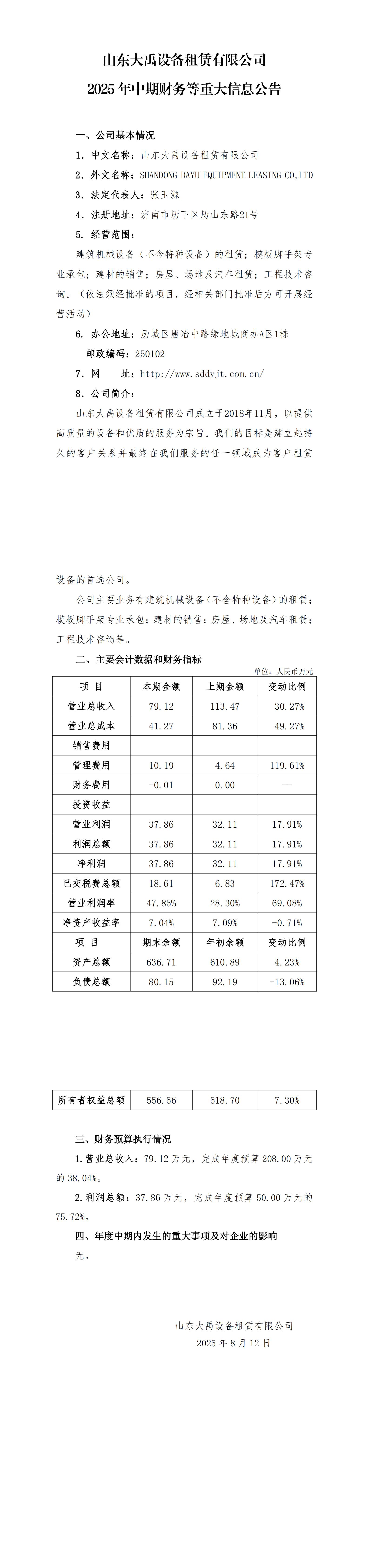 山東大禹設備租賃有限公司2025年中期財務等重大信息公告