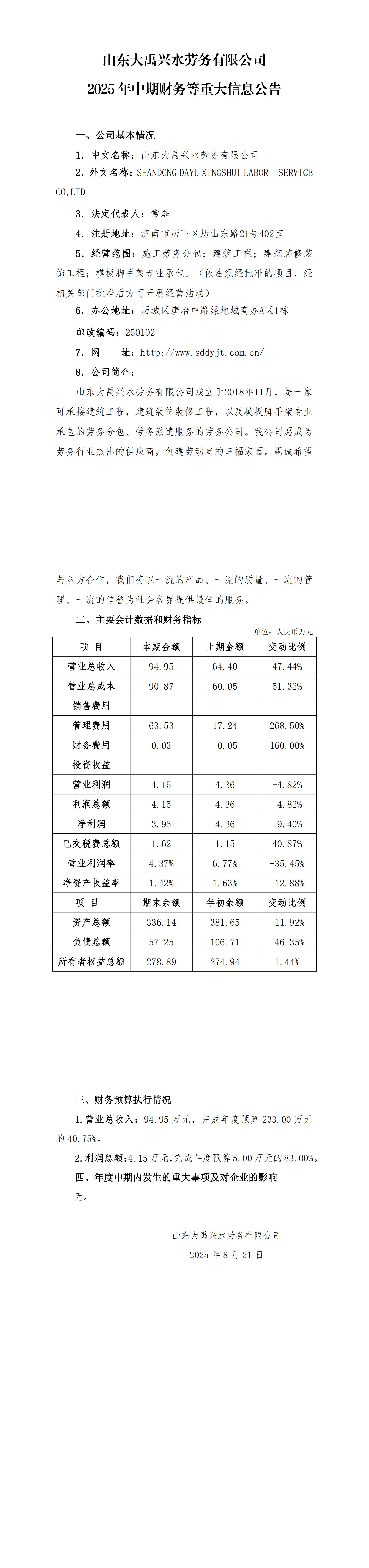 山東大禹興水勞務有限公司2025年中期財務等重大信息公告