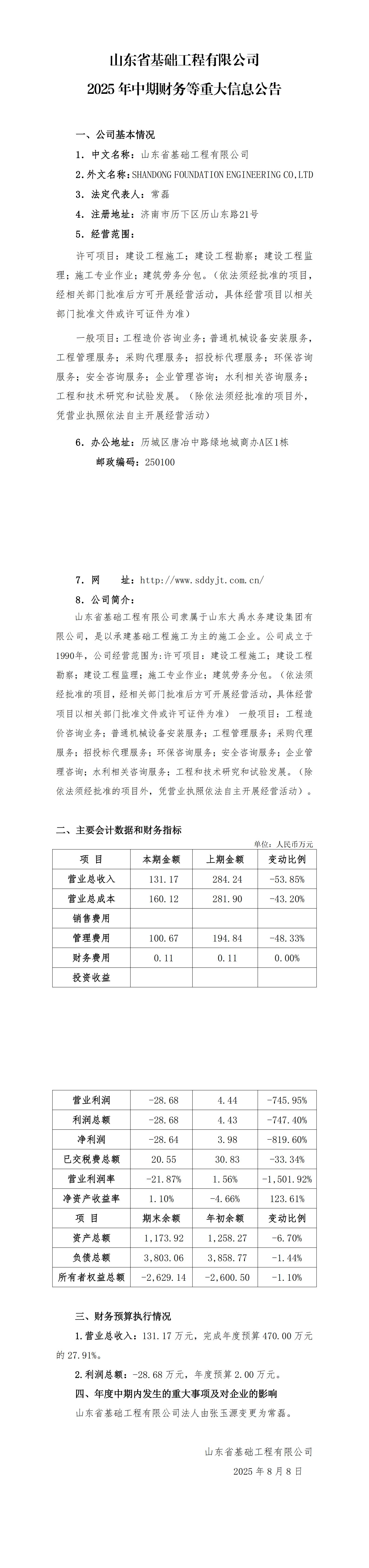山東省基礎工程有限公司2025年中期財務等重大信息公告
