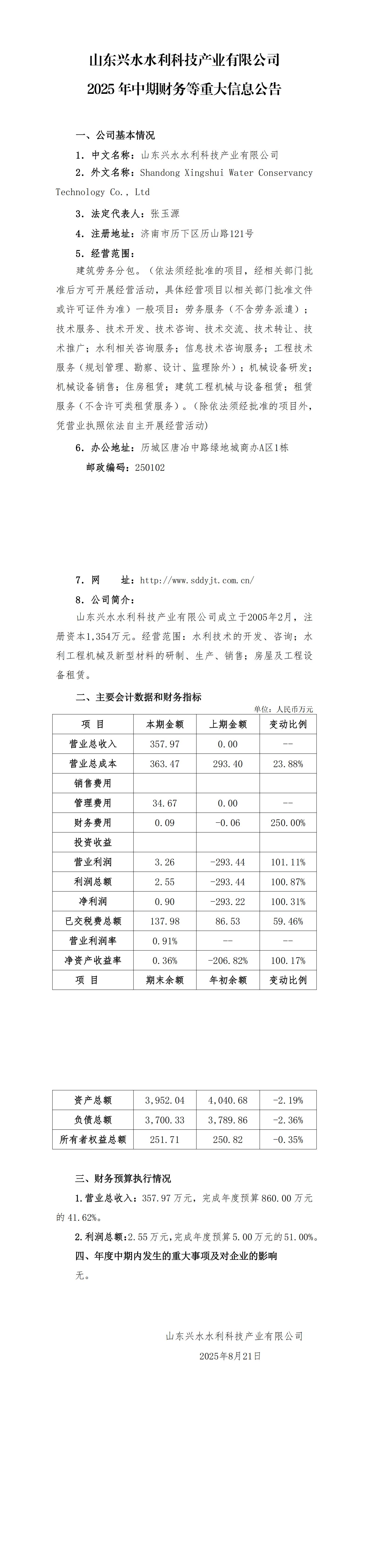 山東興水水利科技產(chǎn)業(yè)有限公司2025年中期財務(wù)等重大信息公告