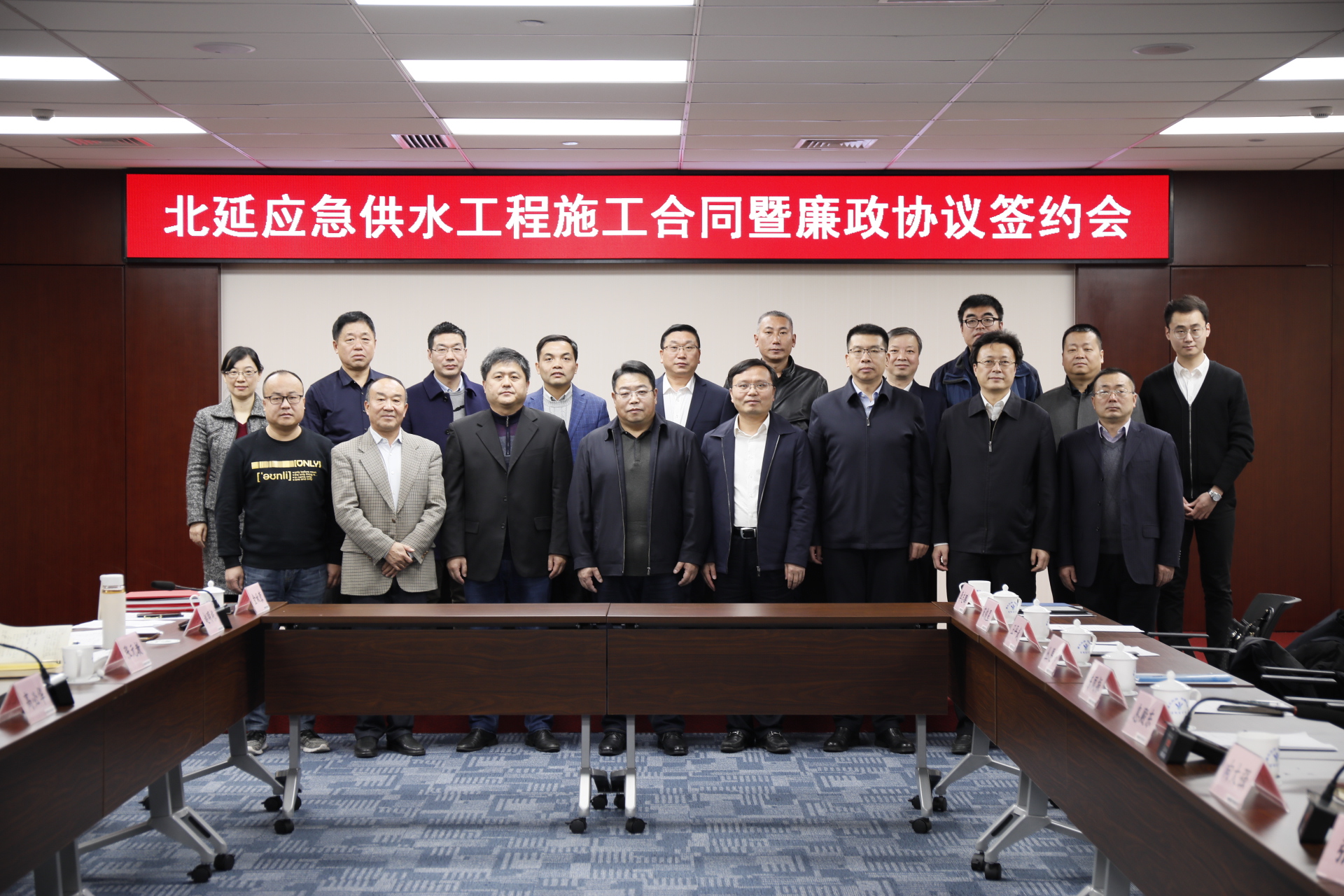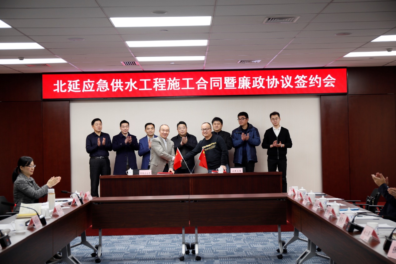 2019年12月13日,南水北調東線一期工程北延應急供水工程施工合同暨廉政協議簽約儀式在北京舉行。南水北調東線總公司趙登峰總經理、高必華副總經理、集團公司張海濤董事長、陳鳳振副總經理出席簽約儀式。