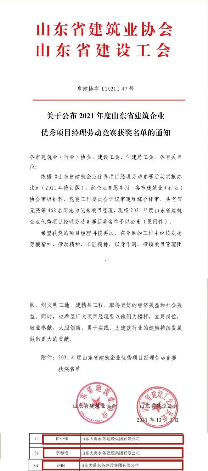 12月6日,山東省建設(shè)工會、山東省建筑業(yè)協(xié)會下發(fā)《關(guān)于公布2021年度山東省建筑業(yè)企業(yè)優(yōu)秀項目經(jīng)理勞動競賽獲獎名單的通知》,大禹集團田中鋒、李春艷、趙盼三位同志通過了競賽工作委員會評議審定和綜合評審,被授予“山東省建筑業(yè)企業(yè)優(yōu)秀項目經(jīng)理”稱號。